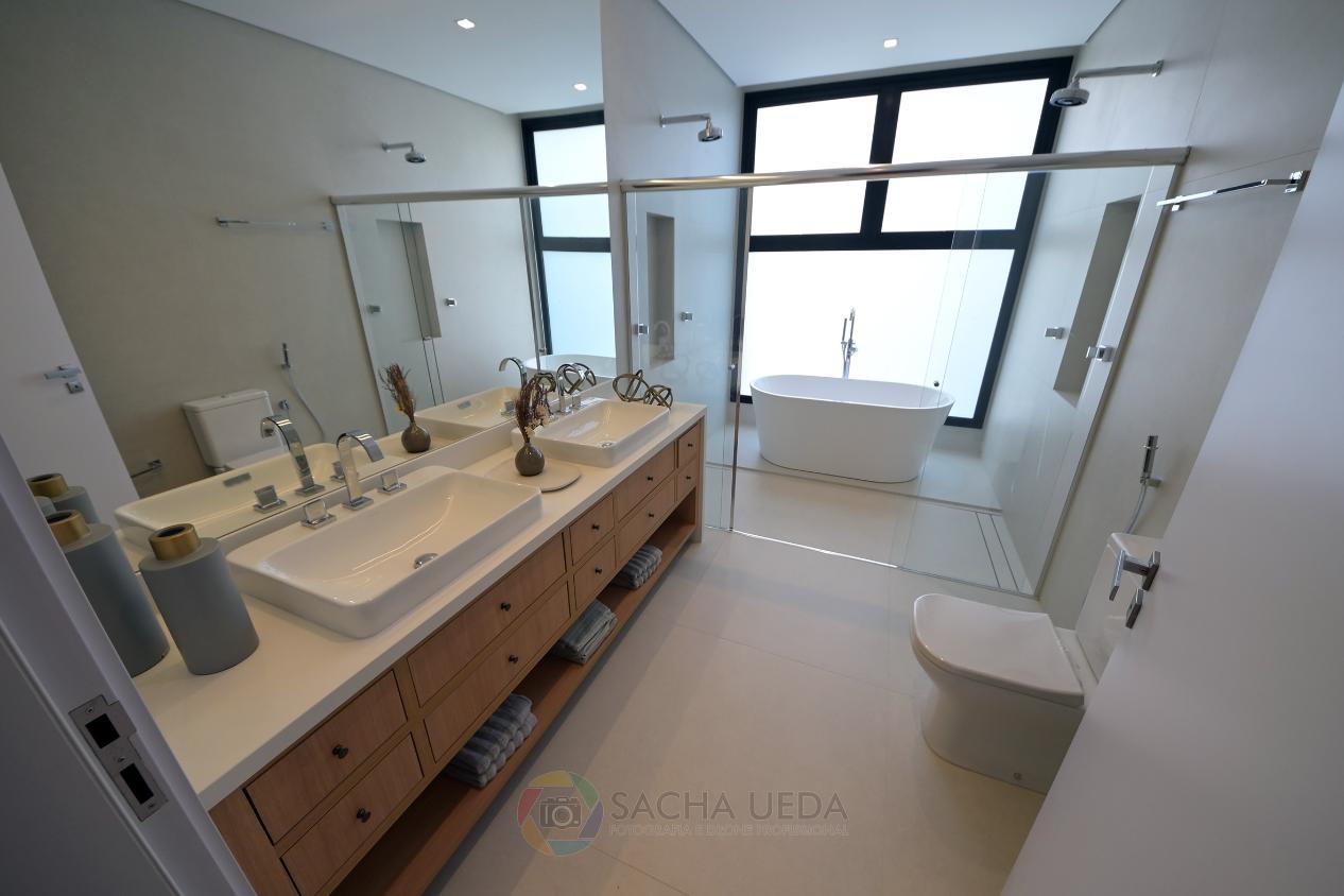 Suíte master possui banheiro com banheira, cubas e duchas duplas.